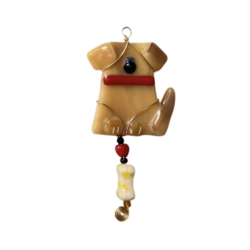 Original design. Each pooch has its own unique personality. Hand-cut glass, assembled and fired. Wire wrapped to complement the color and design of each piece. Color: Butterscotch, wrapped with Gold wire. Approximate Size: 2.25″W x 4″L