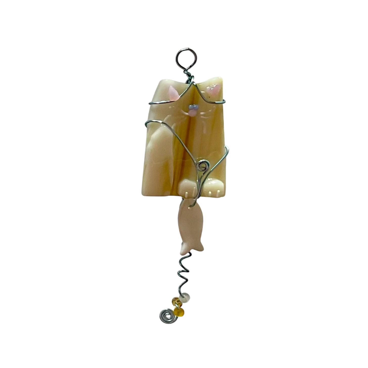 Original design. Each kitty has its own unique personality. Hand-cut glass, assembled and fired. Wire wrapped to complement the color and design of each piece. Color: Buff, wrapped with Light Blue wire. Approximate Size: 1.5″W x 4.25″L