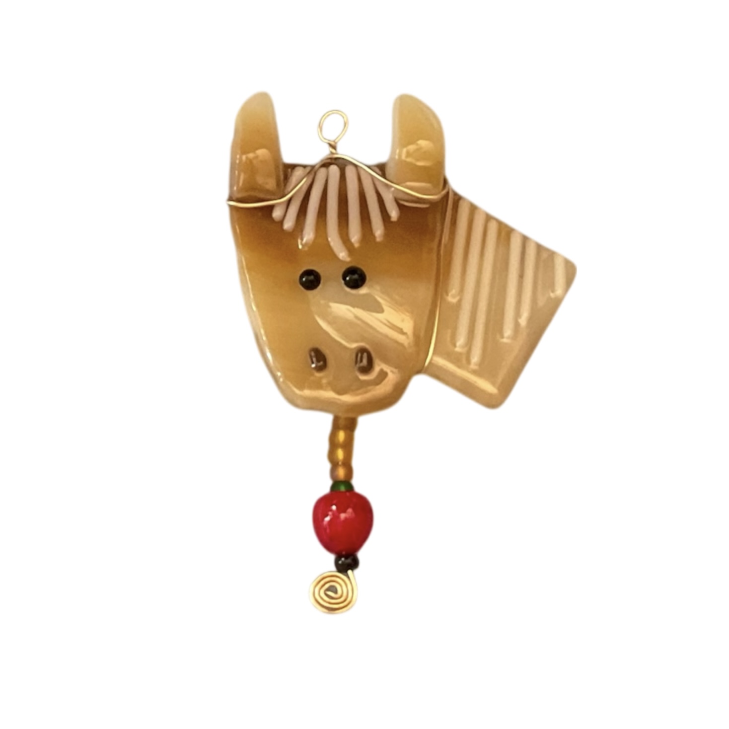 Original design. Each piece is designed to capture the essence of one of the beloved residents of Mockingbird Farm Sanctuary and has its own unique personality. Hand-cut glass, assembled and fired. Wire wrapped to complement the color and design of each piece. 100% of proceeds from this Mockingbird Farms Sanctuary Ornamental purchase will be donated to Mockingbird Farm Animal Sanctuary. Color: Butterscorth with Silver wire. Approximate Size: 1.5″W x 3.0″L