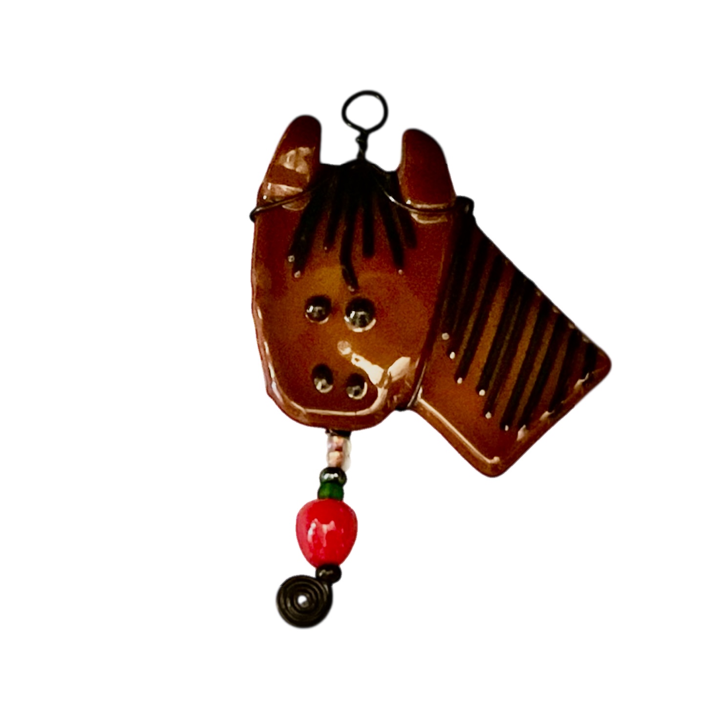 Original design. Each piece is designed to capture the essence of one of the beloved residents of Mockingbird Farm Sanctuary and has its own unique personality. Hand-cut glass, assembled and fired. Wire wrapped to complement the color and design of each piece. 100% of proceeds from this Mockingbird Farms Sanctuary Ornamental purchase will be donated to Mockingbird Farm Animal Sanctuary. Color: Chestnut Brown with Black wire. Approximate Size: 1.5″W x 3.0″L